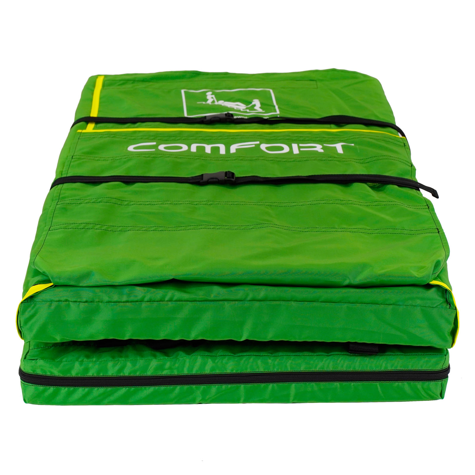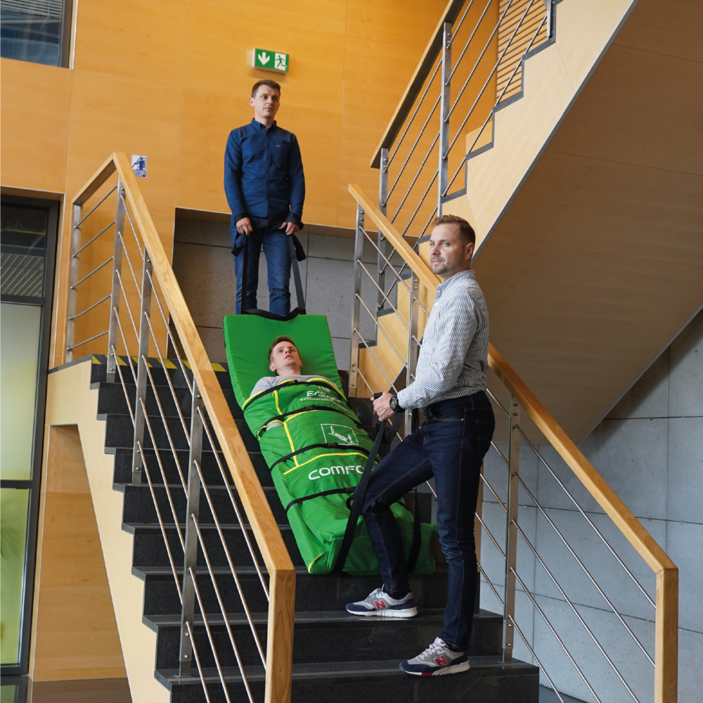 Został zaprojektowany do transportu osób w pozycji leżącej po schodach i poziomym podłożu. Umożliwia dwóm osobom bezpieczną ewakuację osoby poszkodowanej. Materac ewakuacyjny COMFORT w wewnątrz zawiera piankę amortyzującą nierówność terenu. Posiada powłokę bakteriobójczą oraz jest trudnopalny - posiadamy certyfikat B1. Pasy od strony głowy i nóg umożliwiają transport. Rzepy oraz pasy zabezpieczają osobę przewożoną.
